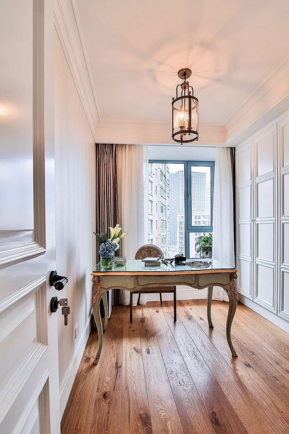 书房的木质地板还泛着结疤,画面是一个通向远方海湾的栈道,